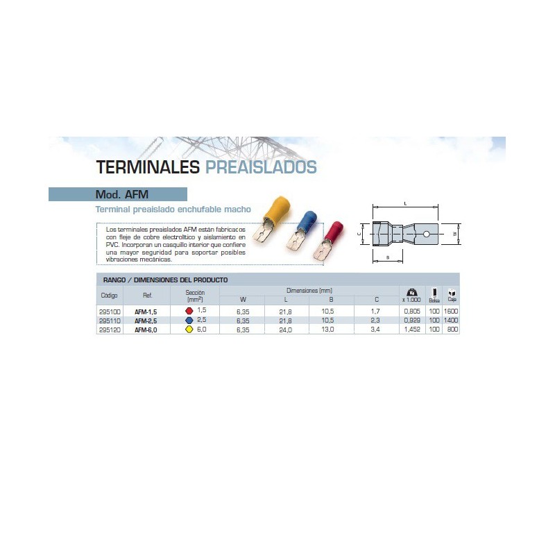 TERMINAL PREAISLADO ENCHUFABLE MACHO MOD. AFM. Los terminales preaislados AFM estan fabricados con fleje de cobre electrolitico siendo el aislamiento en PVC. Incorporan un casquillo interior que le confiere una mayor seguridad para soportar vibraciones mecanicas.
